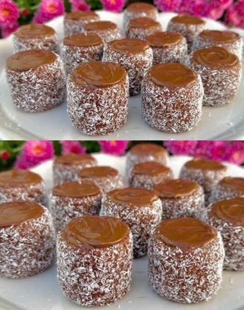 - Tavaleste fiecare bucățică prin nucă de cocos și unge partea de sus cu Nutella (poți folosi o linguriță sau un cornet mic). Lasă-le la rece 20–30 minute ca să se întărească ușor — sau servește imediat, dacă le vrei moi.