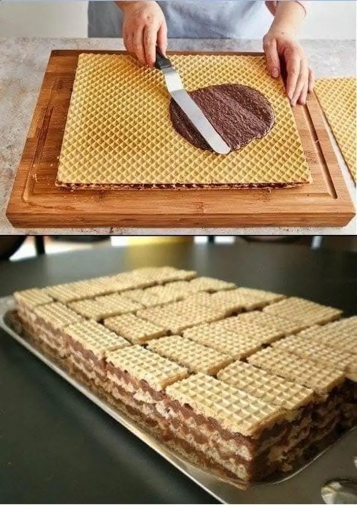 Așază prima foaie de napolitană pe masă cu partea plină de găuri în sus (aceasta reține mai bine crema). Întinde un strat uniform de cremă pe toată suprafața. Așază deasupra a doua foaie de napolitană, cu partea netedă în jos, pentru a se lipi mai bine. Repetă procesul până termini toate foile și întreaga cantitate de cremă.