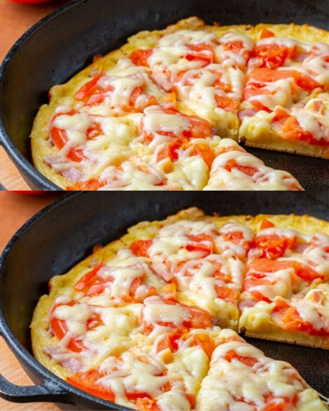 Pizza de casă gata în 10 minute – rețetă rapidă și gustoasă preparată la tigaie, din 2 ouă, făină, chefir, roșii, șuncă și cașcaval. Perfectă pentru o cină simplă și delicioasă!