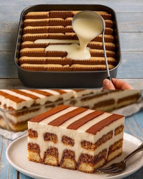 Folosește biscuiți mai groși. Cei simpli cu cacao sau tip Petit Beurre sunt perfecți — se înmoaie frumos fără să se dezintegreze.