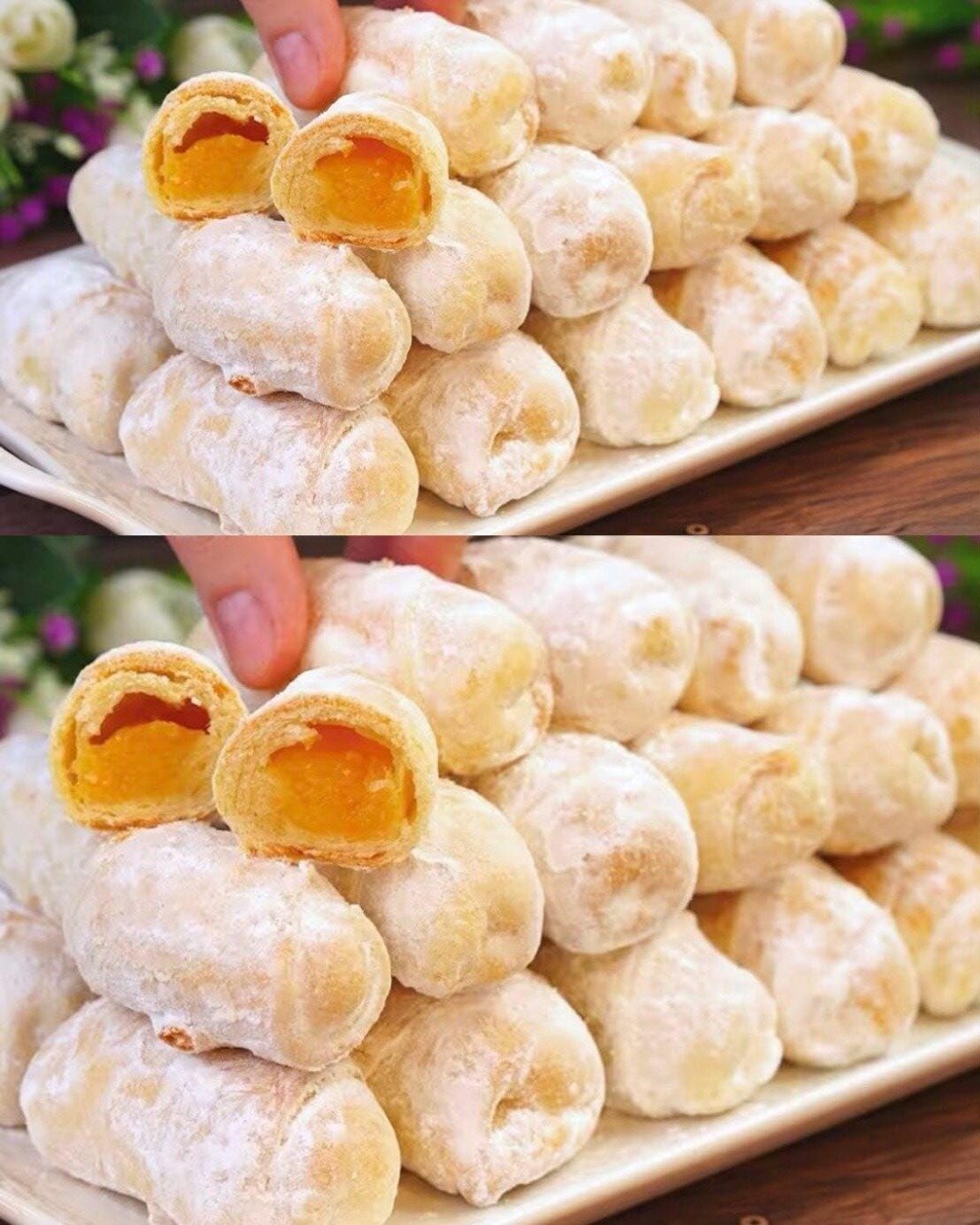 Așază prăjiturelele într-o tavă unsă cu puțin ulei. Coace-le într-un cuptor preîncălzit la 180°C timp de 30-35 de minute sau până devin aurii și crocante. După răcire, trece prăjiturelele prin zahăr pudră pentru un finisaj festiv și aromat.