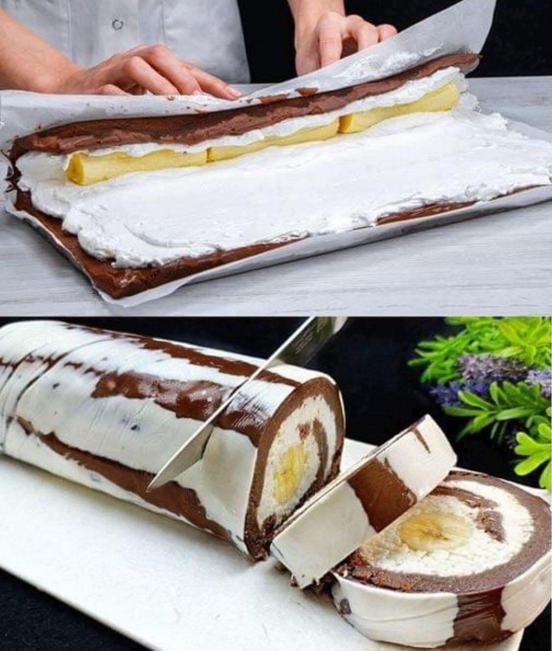 Bate smântâna rece până devine frișcă fermă, îndulcește cu zahăr pudră după gust și încorporează nuca de cocos. Întinde un strat uniform din cremă peste baza răcită, la un capăt așază feliile de banană (1–2 bucăți, tăiate pe lungime). Cu ajutorul foliei, rulează strâns dreptunghiul și strânge marginile. Pune rulada la frigider 30–40 minute pentru ca textura să se așeze.
