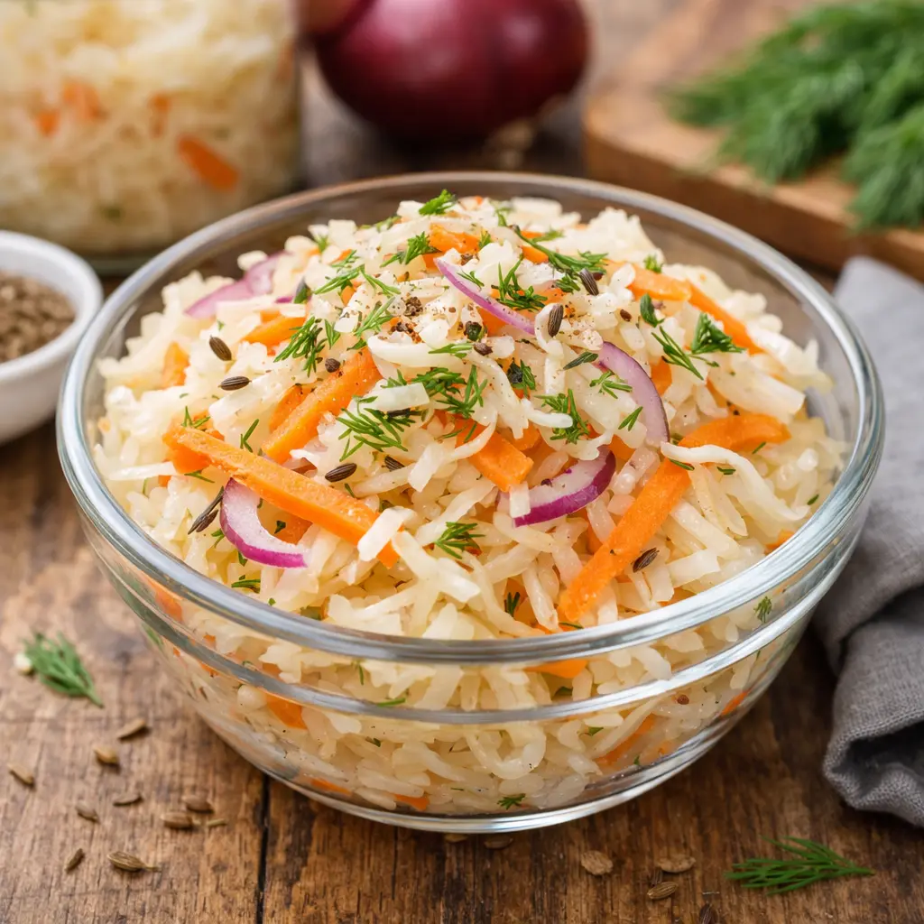 Lasă salata de varză murată de post 15–20 de minute înainte de servire pentru a obține un gust mai intens.